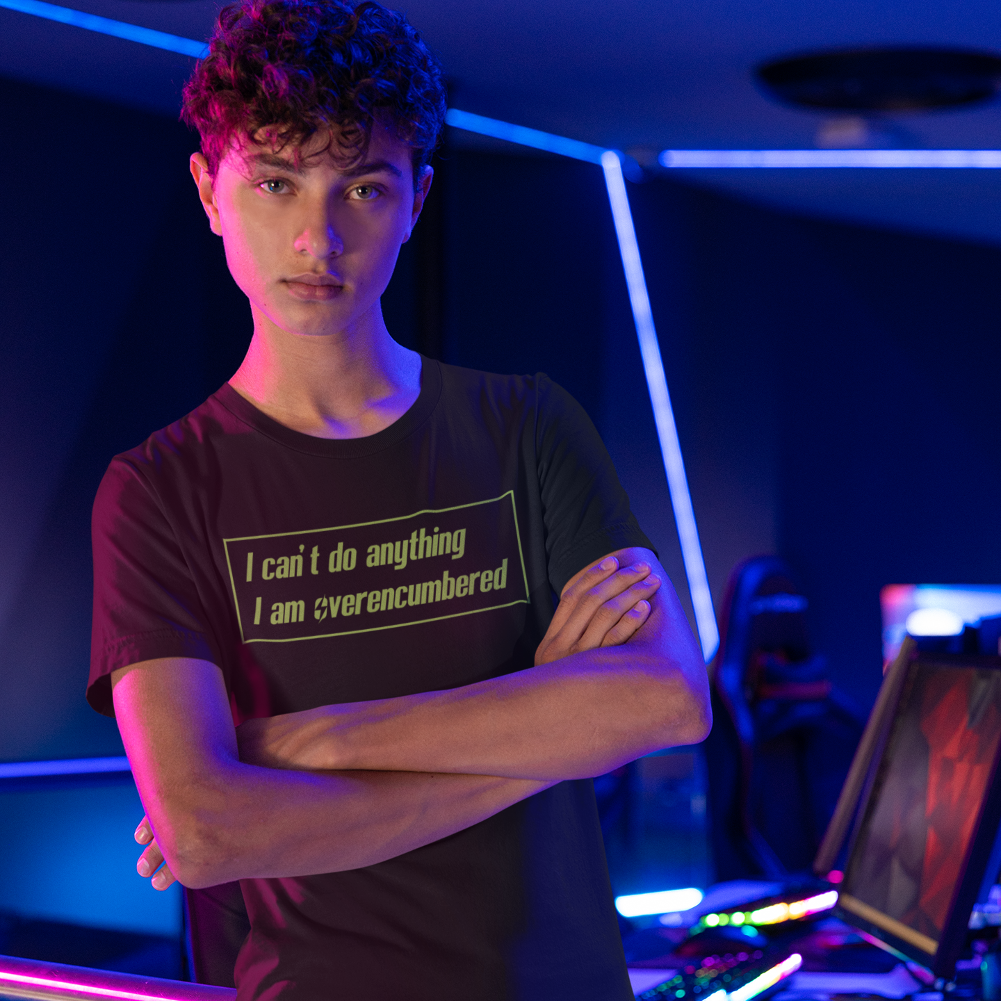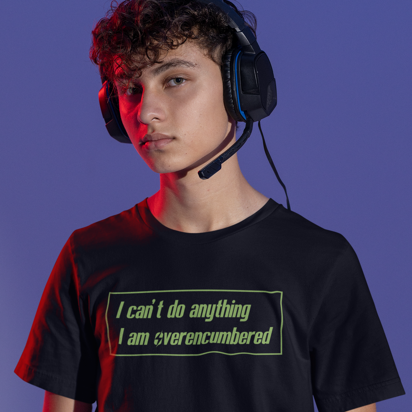 Take a load off—literally—with our "I Can't Do Anything, I Am Overencumbered" t-shirt, a nod to the popular Fallout series that speaks to both gamers and life’s everyday adventurers. Featuring a retro Vault-Tec-inspired design, it shows we all struggle under the weight of the world around us at one point or another.