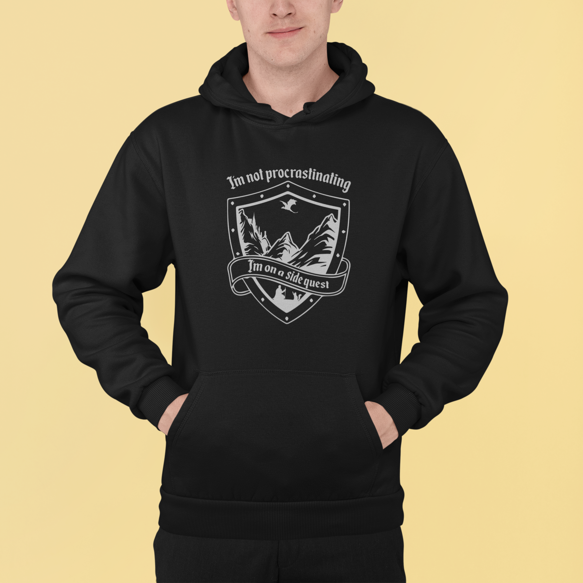 Our highly popular "I'm not procrastinating, I'm on a side quest" design is now in hoodie form! This hoodie is perfect for anyone who loves to play RPGs and knows that sometimes the side quests are just as important as the main quest.