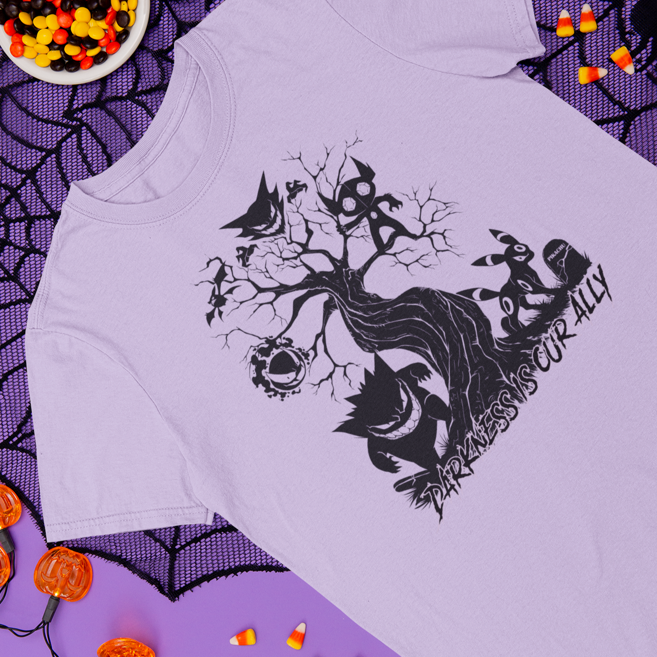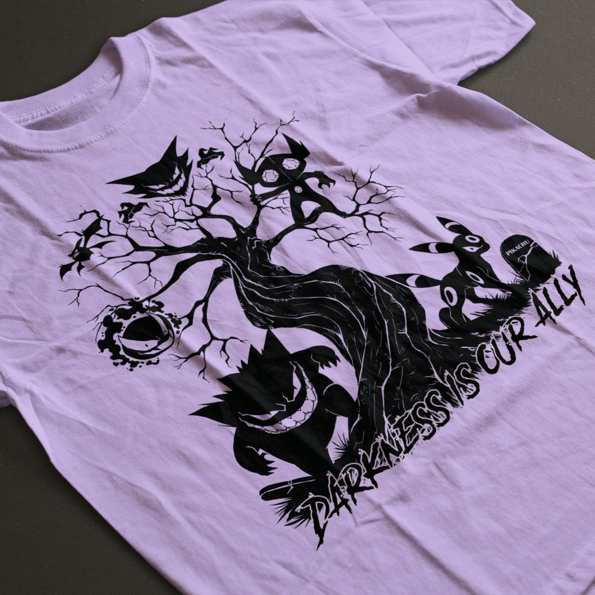 Are you a fan of Ghost and Dark-type Pokémon? Then you'll love this t-shirt featuring your favorite spooky creatures with the bold headline "Darkness is our ally".