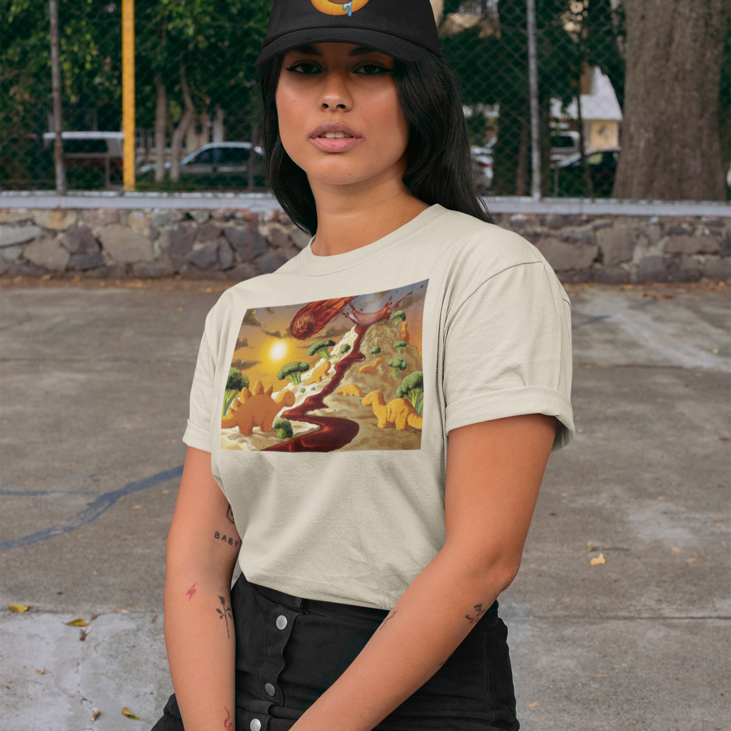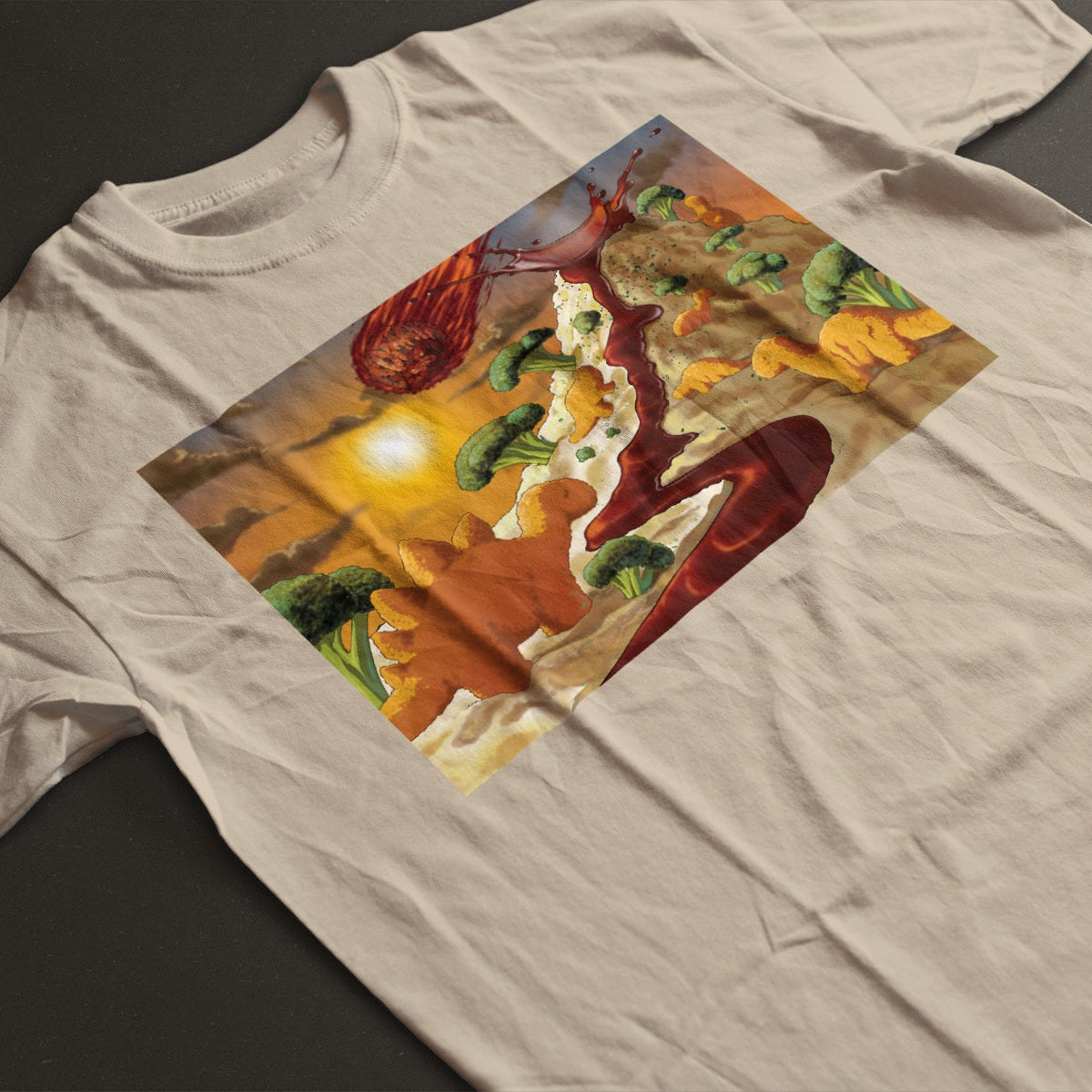 Step back in time—waaaay back—to when the Earth was ruled by giant, majestic creatures… made entirely of processed deliciousness. This prehistoric landscape is teeming with dino chicken nuggets roaming the ketchup plains, while broccoli trees sway gently in the ranch-dressing breeze. Volcanoes erupt molten gravy, and somewhere off in the distance, a pack of wild mozzarella sticks stalk their prey.