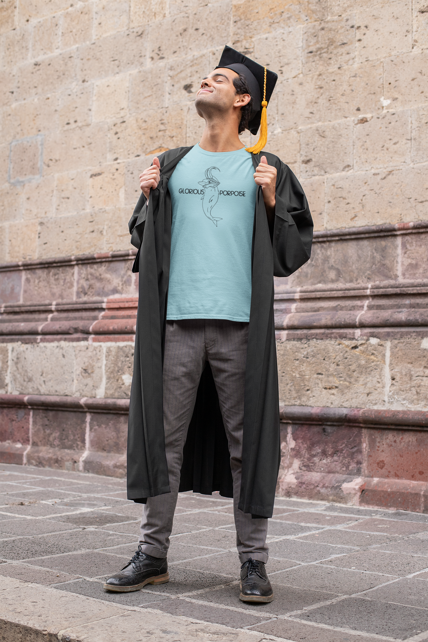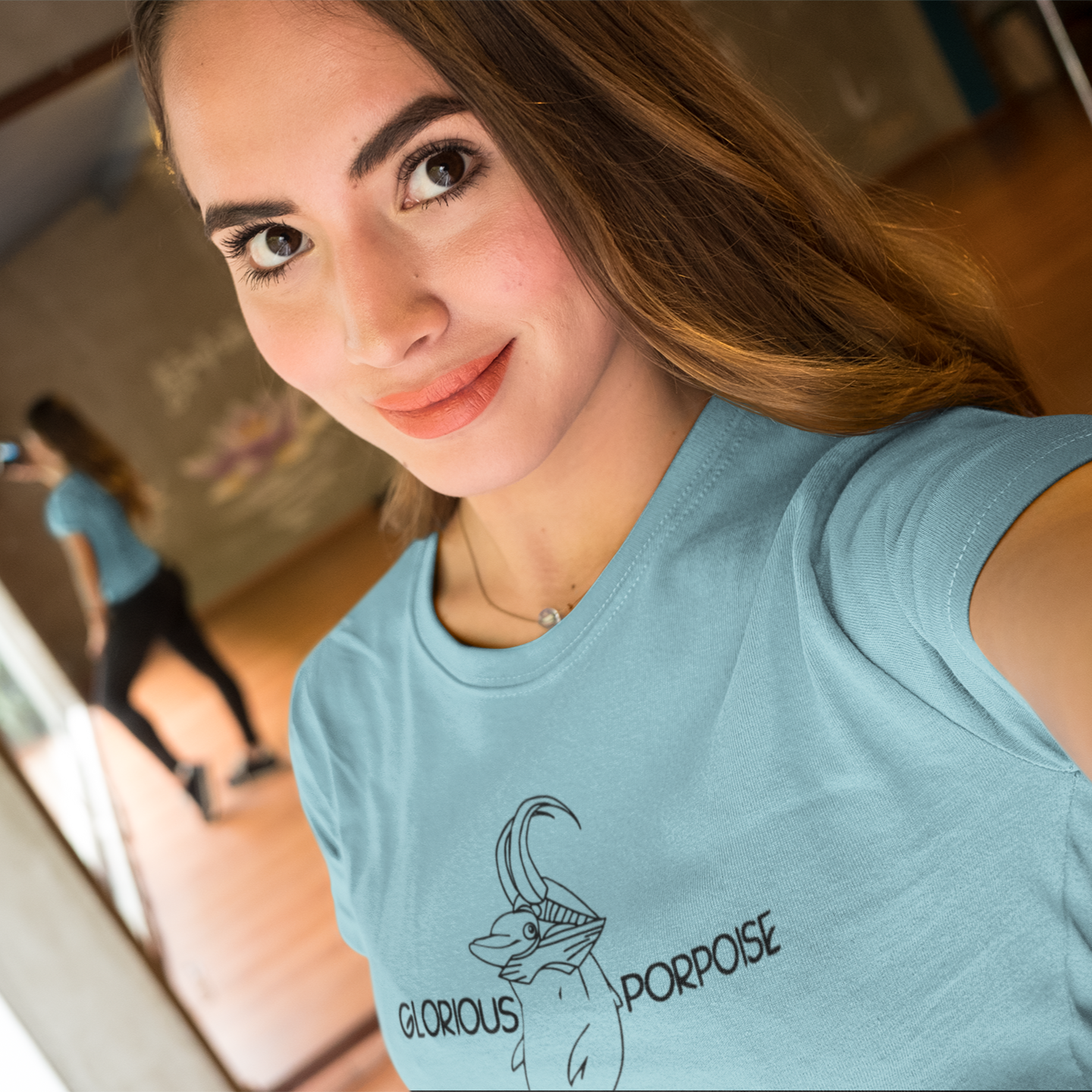 Introducing our "Glorious Porpoise" design, where playful sea life meets Norse mischief! This fun and unique design features a charming porpoise donning Loki's signature horned helmet, radiating both cuteness and chaos. Below the graphic, the phrase "Glorious Porpoise" is boldly displayed, adding a humorous twist to the shirt.