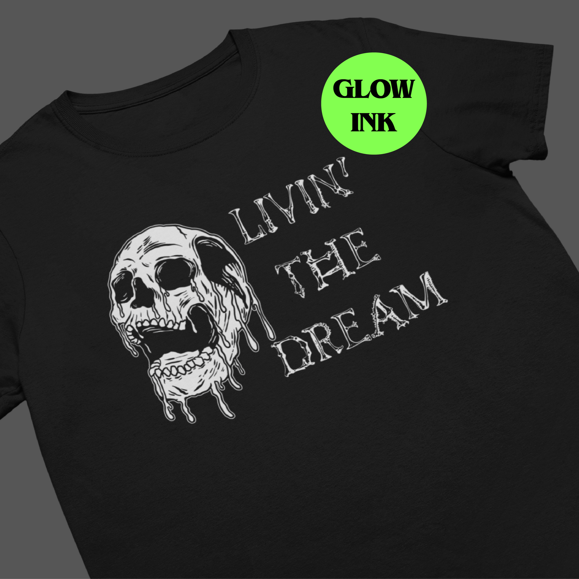 Step into the surreal with this edgy, glow-in-the-dark "Livin' the Dream" design, featuring a melting skull that oozes coolness. Perfect for those who embrace life’s darker, ironic side, the skull design represents the ultimate blend of rebellion and laid-back vibes. As the lights go out, the special ink on the skull and text comes alive, glowing eerily in the dark for a bold statement both day and night.