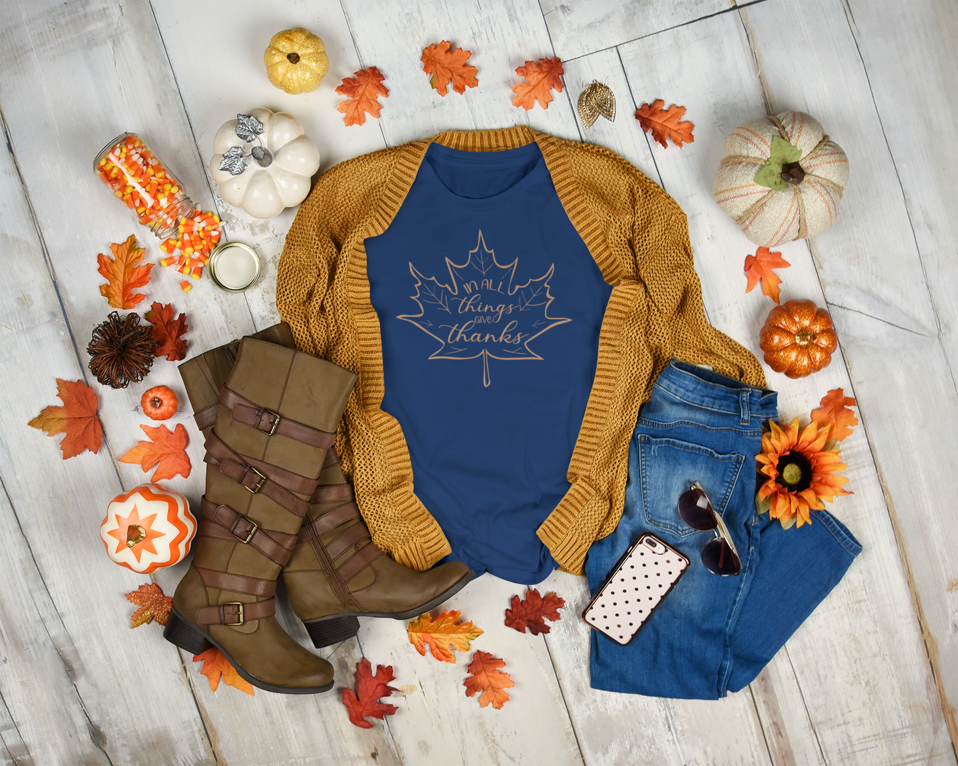 Introducing our "In All Things Give Thanks" T-shirt – a meaningful and stylish way to express gratitude every day. Made from premium, ultra-soft cotton, this t-shirt ensures both comfort and durability, making it perfect for everyday wear. The design features a beautiful leaf in metallic gold ink and the phrase "In all things, give thanks".